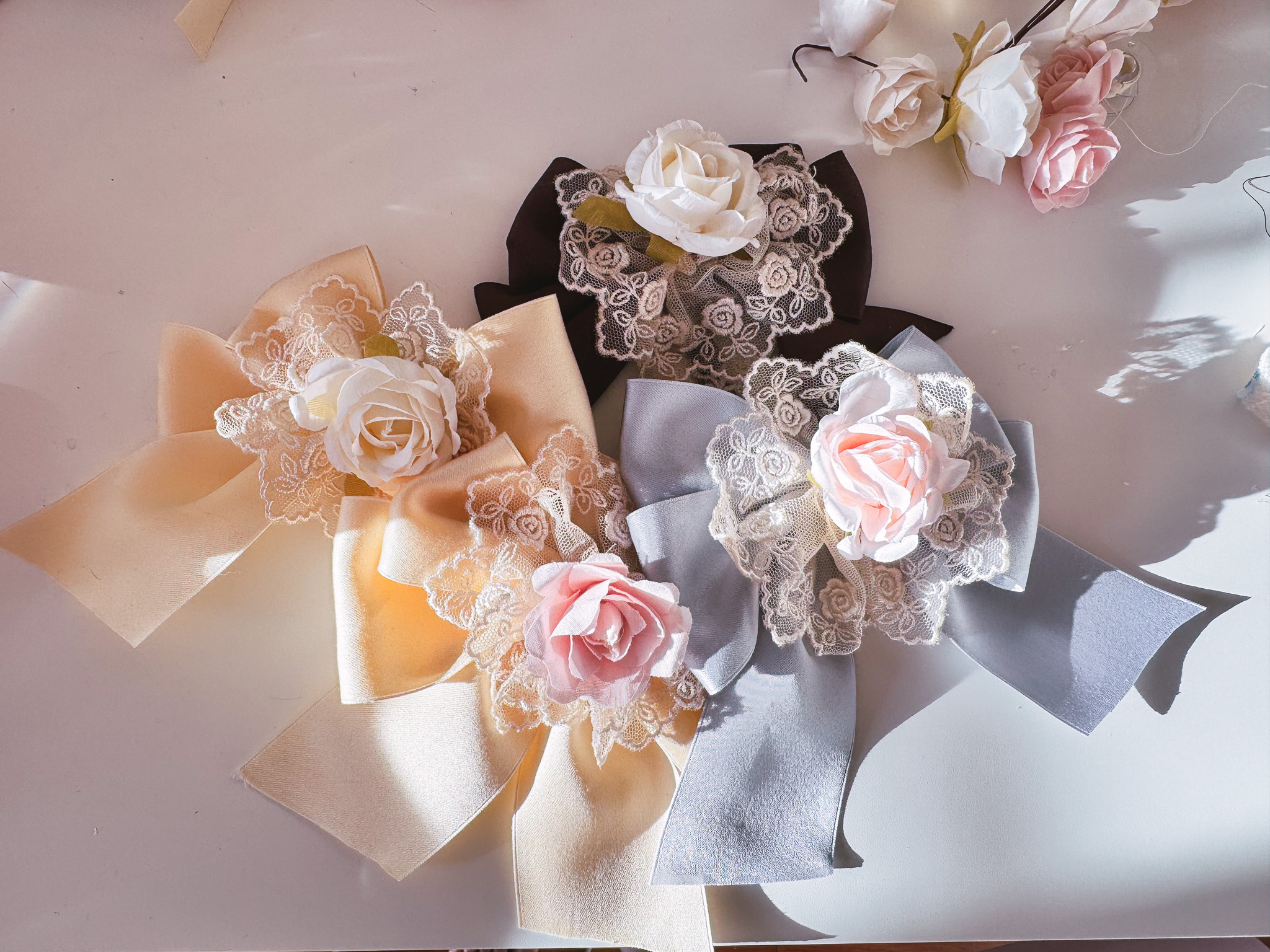 Each piece is crafted with care in California — from tapestry ribbon headdresses and ribbon-rose combs to felt magnets and vinyl stickers. Made to spark comfort, softness, and a little bit of daydream.
